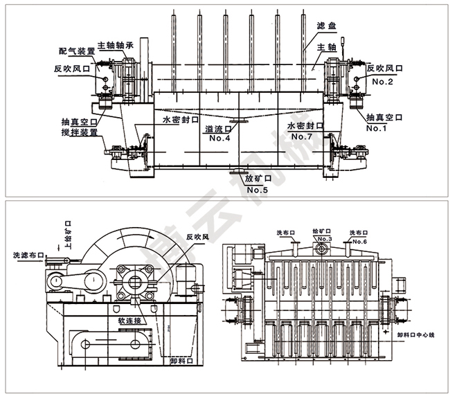 盤式真空過濾機由各個單獨的扇形片的圓盤構成。每一個扇形片為 單獨的過濾單元,由濾布做成布套在扇形片上形成濾室。過濾盤由電機通過減速器及開式齒輪傳動來驅動 ,過濾盤順時針方向轉動,濾室里的礦漿在吸附區借助于真空泵在過濾介質兩側形成的壓力差,附著在過 濾盤上形成濾餅后,攪拌器旋轉防止固體沉淀,濾餅離開液面后,在真空作用下繼續脫去水分。濾液透過 濾布,經過濾液管,從分配頭排出。濾餅在卸料區由反吹風卸料落入排料槽,整個作業過程連續循環進行 。